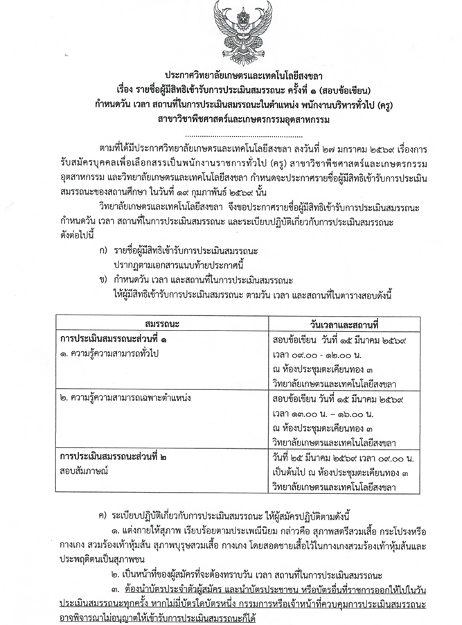 ประกาศวิทยาลัยเกษตรและเทคโนโลยีสงขลาเรื่อง รายชื่อผู้มีสิทธิเข้ารับการประเมินสมรรถนะ ครั้งที่ ๑ (สอบข้อเขียน)กำหนดวัน เวลา สถานที่ในการประเมินสมรรถนะในตำแหน่ง พนักงานบริหารทั่วไป (ครู) สาขาวิชาพืชศาสตร์และเกษตรกรรมอุตสาหกรรม
