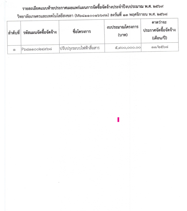 ประกาศแผนการจัดซื้อจัดจ้าง รายการปรับปรุงระบบไฟฟ้าสื่อสารประจำปีงบประมาณ พ.ศ. 2569