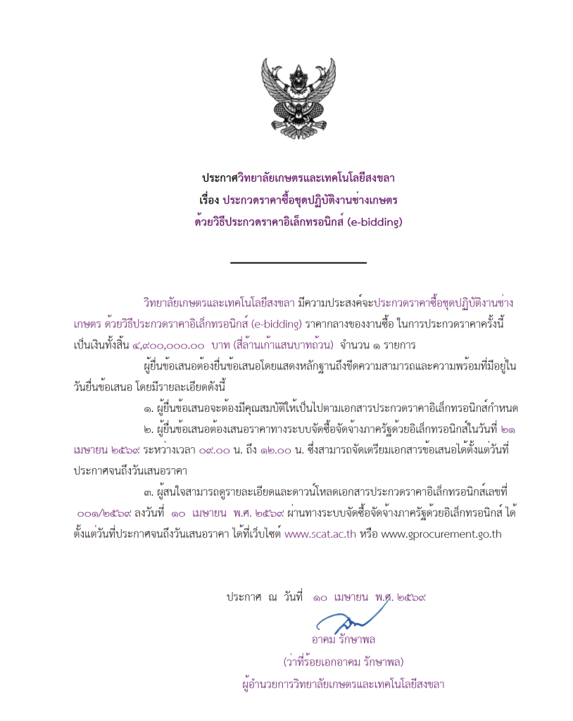เรื่องการประกาศของการประกวดราคาชุดปฎิบัติงานช่างเกษตรด้วยวิธีประกวดราคาอิเล็กทรอนิกส์ e-bidding